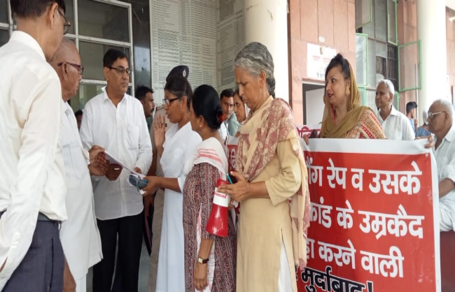 गुजरात मे बिलकिस बानो से 2002 में गैंग रेप कर उनके परिवार के 14 सदस्यों की हत्या की गई थी, उन 11 हत्यारों की सजा माफ करने पर विरोध प्रदर्शन कर धरना देकर राष्ट्रपति के नाम ज्ञापन सौंपा।