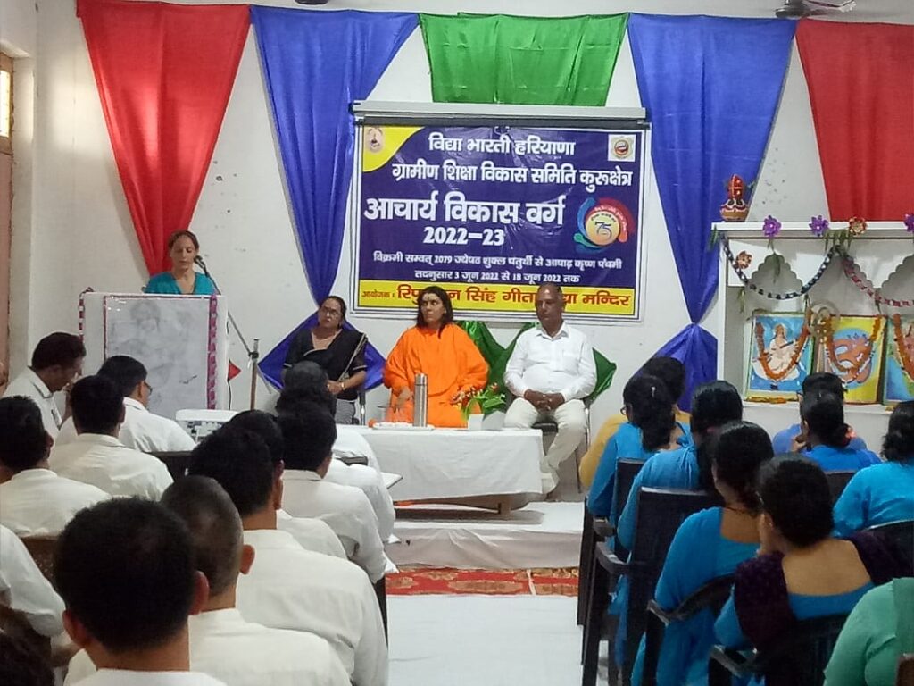 बाबैन, शर्मा । रिपुसूदन सिंह गीता विद्या मंदिर स्कूल के सभागार में ग्रामीण शिक्षा विकास समिति कु रुक्षेत्र के तत्वावधान में आयोजित पन्द्रह दिवसीय आचार्य विकास वर्ग का आयोजन किया गया । वर्ग के दिशाबोध सत्र में ‘राष्ट्र के विकास में भारतीय नारी का योगदान ‘ विषय पर आचार्यों को संबोधित करते हुए ब्रह्मऋषि कॉलेज विराटनगर पिंजोंर से चेयरपर्सन साध्वी डॉ. अमृता दीदी ने कहा की आज भारतीय नारी को आपनी शक्ति को पहचानने की जरूरत है, यदि हम अपने प्राचीन इतिहास पर नजर डाले तो
