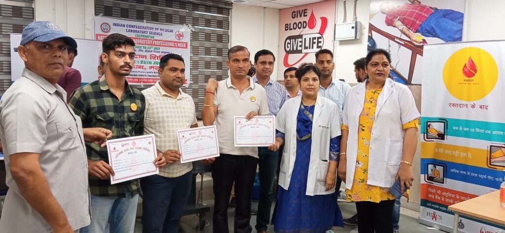 कुरुक्षेत्र । मेडिकल लेबोरेट्री टेक्नीशियन एसोसिएशन द्वारा मनाए जा रहे लैब प्रोफेशन वीक के तहत शनिवार को समापन अवसर पर एलएनजेपी अस्पताल के ब्लड बैंक में रक्तदान शिविर का आयोजन किया गया। शिविर के संचालन में सर्व समाज कल्याण सेवा समिति के पदाधिकारियों ने सहयोग किया। इस अवसर पर अस्पताल के कार्यकारी चिकित्सा अधीक्षक डा. श्याम सुंदर अरोड़ा बतौर मुख्यातिथि मौजूद रहे।