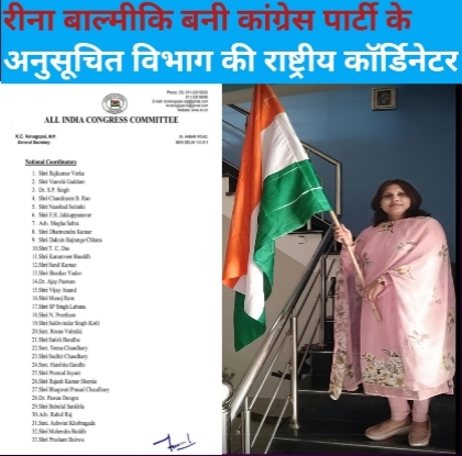 नई दिल्ली । कांग्रेस पार्टी ने कुरुक्षेत्र की रीना बाल्मीकि को बड़ी जिम्मेदारी सौंपते हुए उन्हें कांग्रेस अनुसूचित जाति विभाग में राष्ट्रीय कॉर्डिनेटर नियुक्त किया है। उनकी यह नियुक्ति पार्टी के भीतर उनके समर्पण और कार्यक्षमता को दर्शाती है, जिसे स्थानीय कार्यकर्ताओं और नेताओं ने ‘अत्यंत सराहनीय’ कदम बताया है।